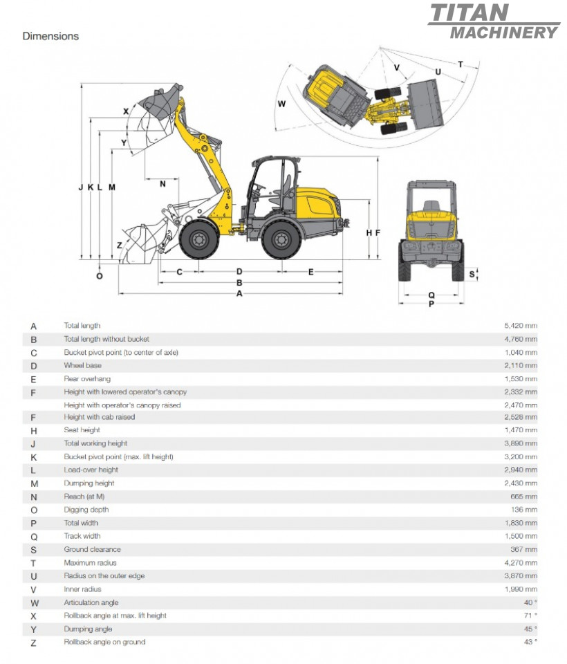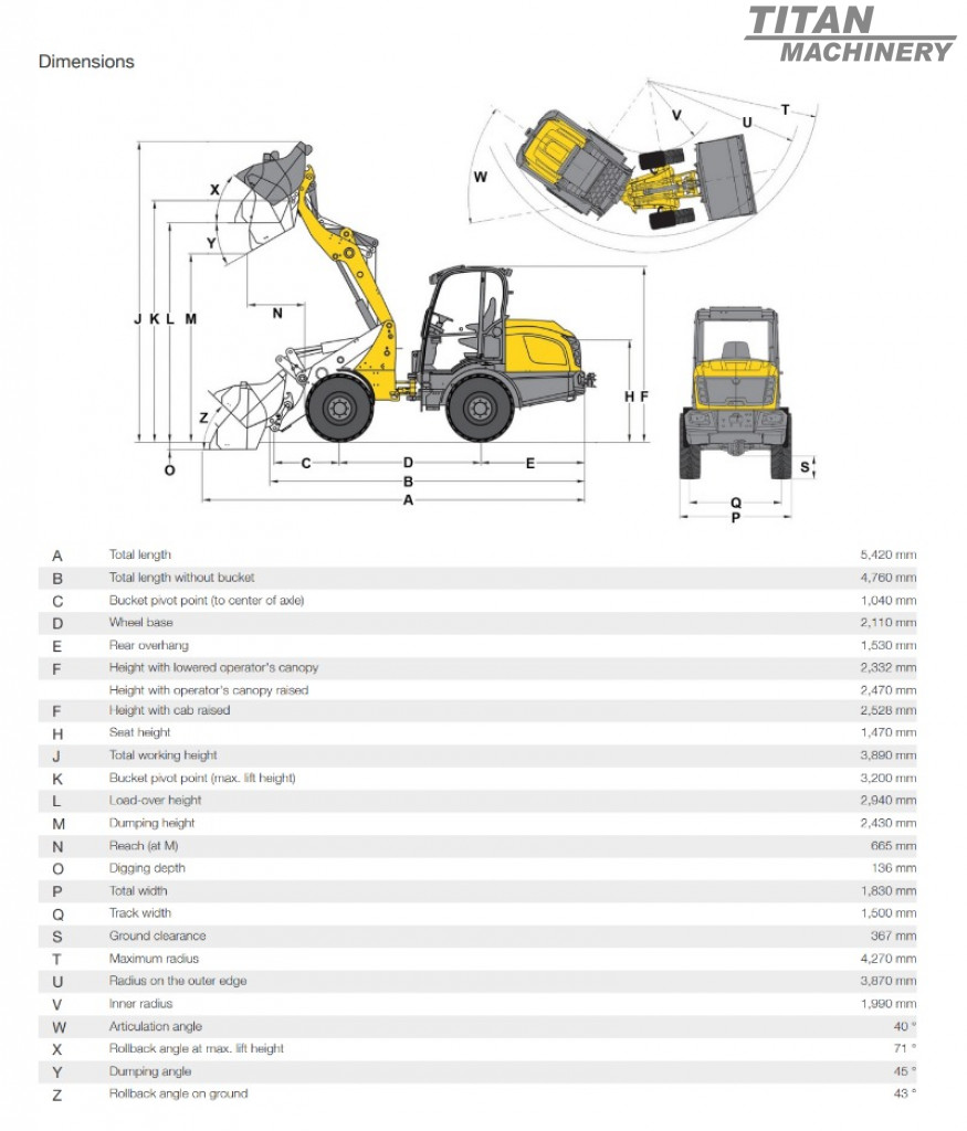 • Inaltimea de descarcare cu cupa basculata la 71°: 2.430 mm